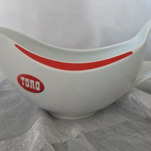 Porsgrund Toro sausnebb i hvitt porselen. Sausnebbet har Toro-logo og rød dekor på siden. Undersiden er merket Porsgrund Porselænsfabrik.
