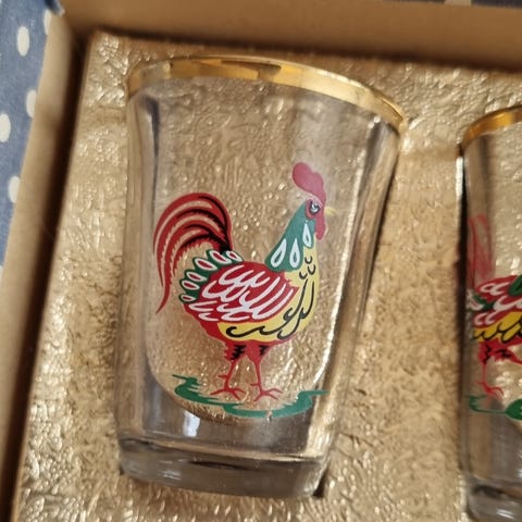 Små gamle glass med gullkant, med forskjellig hestemotiv.ca 5 cm