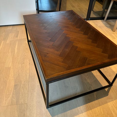Oprinnelig hvitlakkert, er nå malt i fargen muskattnøtt, fargen flasser over noen steder så ville enten malt på nytt eller slipt bordet. Glassplaten er frostet. Må hentes.
