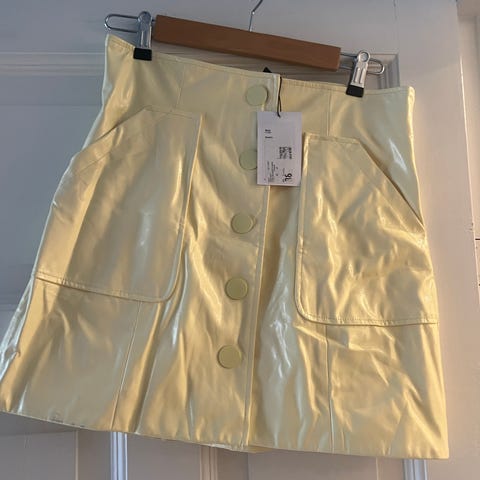 Ganni skinnskjørt til dame i størrelse 36. Skjørtet er i svart skinn. Passer til hverdagsbruk eller mer pyntede anledninger, avhengig av styling. Selges for 400kr.