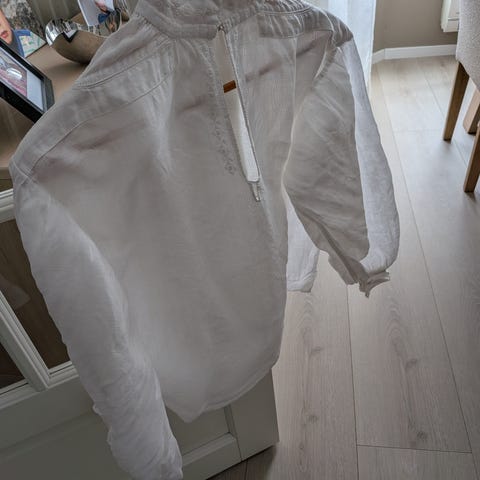 Håndbrodert lin-skjorte til vestfoldbunad 1932. Min farmor har brodert den til meg da jeg sto til konfirmasjon i 2016. Etter 10 år har den blitt for trang og derfor selger jeg den. Den er pent brukt for å være 10 år gammel. Aldri vært utsatt for vanskelige flekker. Vasket før salg!