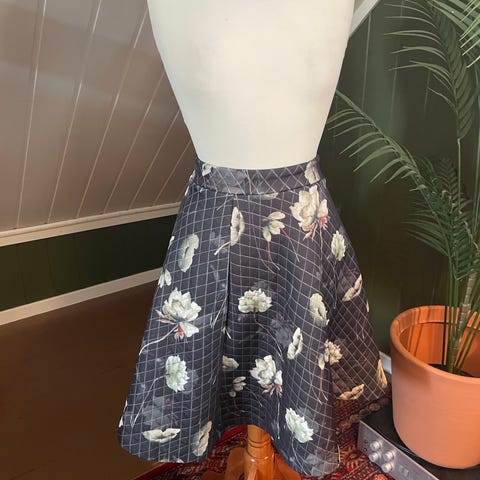 Blomstret skjørt, passer xxs-xs. Flerfarget blomstermønster på mørk bakgrunn. Det har dekorative knapper på fremsiden og elastisk linning i livet. Passer til hverdagsbruk og kan kombineres med ulike topper og jakker.