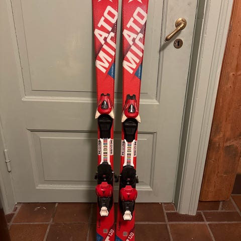 Völkl Racetiger GS alpinski 120 med integrerte bindinger. Modellen er en storslalåmorientert alpinski med markert spenn og relativt smal midje, egnet for preparerte bakker. Skiene har oransje og svarte detaljer i toppsheet og sorte såler. Bindingene er montert på platesystem og kan justeres innenfor et visst skostørrelsesområde. Passer til bruk i alpinanlegg for kjøring i høyere hastigheter og lange svinger på hardt og middels hardt underlag.