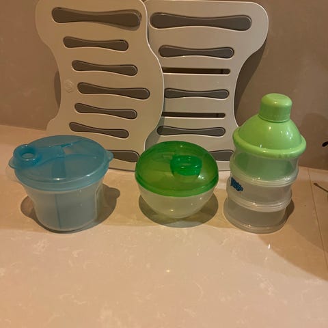Sett med utstyr til baby som består av flaskeholder for tørking av tåteflasker, flere smokkesnorer og en beholder for oppbevaring av morsmelkerstatning eller melkepulver. Flaskeholderen har flere stenger for plassering av flasker og tilbehør. Smokkesnorene har ulike utforminger og festes med klips. Pulverboksen har lokk og flere rom for porsjonsvis oppbevaring av pulver. Egnet til bruk i hjemmet eller på reise for organisering av flasker, smokker og pulver.