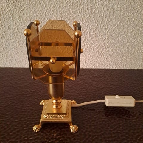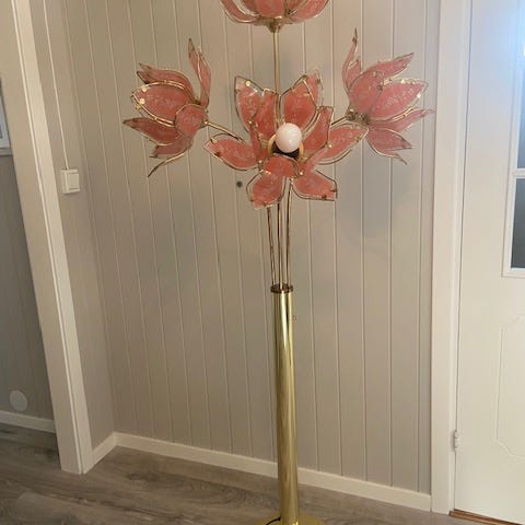 Lampen har 3 lyskilder, som tennes ulikt alt etter hvordan du skrur bryteren. Alle skjermer er originale og intakte, og lampen fungerer som den skal. Lampen er 178 cm høy.