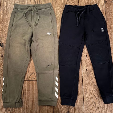 Myke og fleksible bukser fra Lindex i str 104. En mørkeblå, to mørkegrønne. Ingen merker eller slitasje utover at ‘merket’ er litt slitt på den ene, se bilde to.