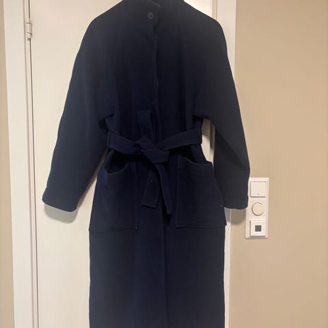 & Other Stories ullkåpe for dame i størrelse S. Kåpen er svart og laget i ull. Modellen har klassisk krage, belte i livet og lengre passform. Passer som yttertøy i kjøligere sesonger.