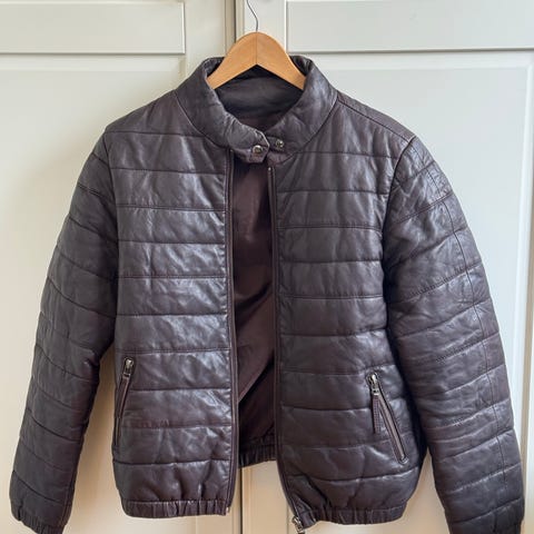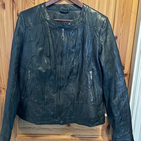 Bomberjakke i skinn. Den er veldig god og behagelig å ha på seg. En veldig god passform og den passer til de fleste anledninger. Den er litt liten i str, vil si en oversize L