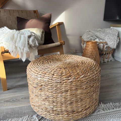 Selger en søt puff i tåkerosa velur. Kun stått på gjesterommet og ikkeblitt brukt til noe.