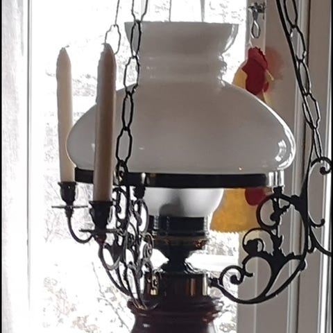 Lampen er genial iom at den både er elektrisk og til bruk for stearinlys. Nemkogodkjent. MS belysning. Ingen skader hverken på kolbe eller kuppel. Passer supert over spisebord på hytta f.eks.