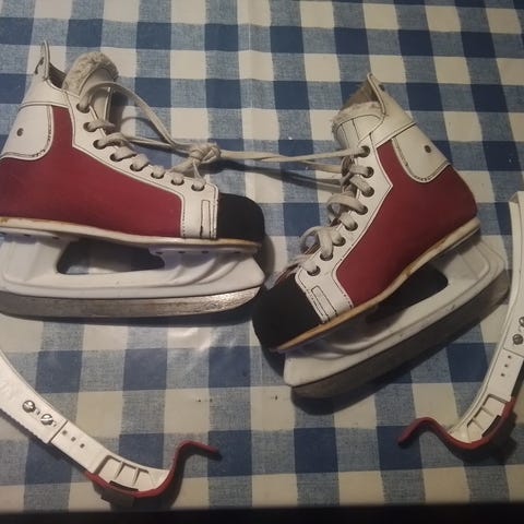 Tilstand: Brukt, med normal slitasje etter alder. Skøytejernene er i god stand.