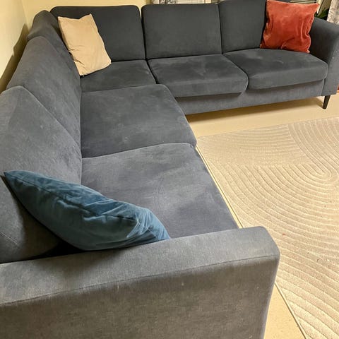 IKEA hjørnesofa i grønn tekstil. Sofaen har god sitteplass med flere seter og vinkelutforming som passer langs to vegger. Rygg- og seteputer er løse og gir mulighet for enkel tilpasning og vedlikehold. Passer i stue eller TV-rom der det er behov for en romslig sittegruppe.