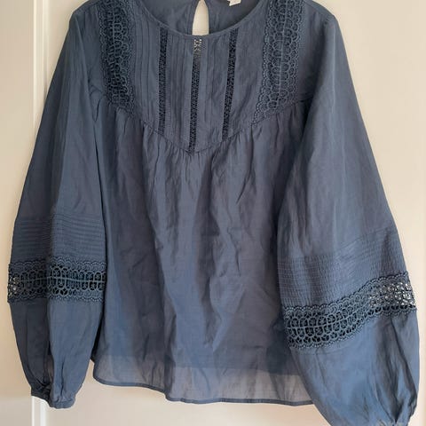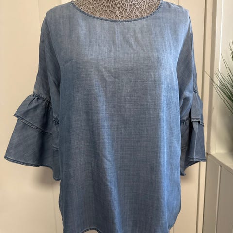 Zara Woman bluse i størrelse M. Blusen er blå og laget av lyocell. Modellen har lange ermer med rynkedetaljer og volangkant nederst på ermene, samt små volanger langs skuldersømmene. Rund hals og åpning med knapp i nakken. Passer som en lett og behagelig topp til hverdagsbruk.