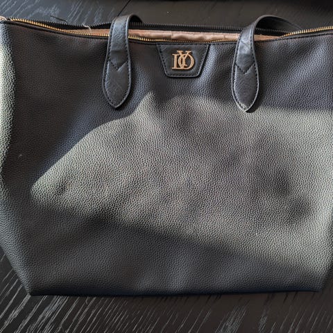 dameveske i svart kunstlær. Vesken har to skulderhåndtak og lukkes øverst. Den har et enkelt, romslig hovedrom som egner seg til hverdagsbruk, jobb eller studier. Materialet er kunstlær, som gir et glatt og ensfarget uttrykk. På forsiden henger en rund metallanheng som dekorativ detalj.
