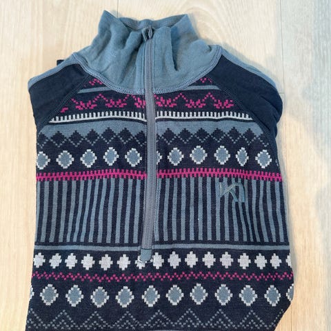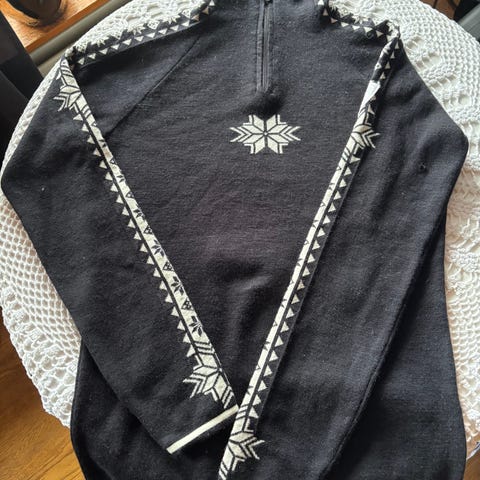 Dale of Norway genser i ull for dame i størrelse L. Genseren er grå med mønsterdetaljer på ermer og en snøkrystall på brystet. Den har høy hals med kort glidelås i kontrastfarge foran. Strikket i ull som gir god isolasjon og egner seg til hverdagsbruk eller som mellomlag på tur og fritidsaktiviteter. Klassisk Dale-mønster langs ermene og rundt skuldrene gir et tradisjonelt preg. Selges billig, pga at den trenger en nål og tråd på høyre arm. Jeg sender gjerne mot porto.