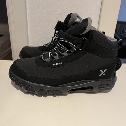 Traxole tursko i størrelse 40 i svart farge. Skoene er ankelhøye med snøring foran og grovmønstret yttersåle som gir godt grep på variert underlag. Overdelen er i tekstil og syntetisk materiale, med polstret kant og pløse for økt komfort. Innvendig er skoene foret, og de har Thinsulate-isolasjon som bidrar til varme og beskyttelse i kjøligere vær.