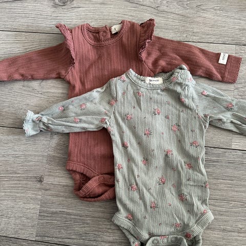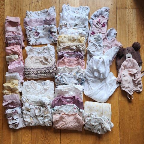 1 sett inkl er Ole Brumm som er body, bukse og lue. Pakken består av plagg fra blant annet HM, Newbie og Name it. Den hvite buksa har flekk forran (se bilde) og noen av sokkene er nuppete, ellers ser alt ut til å være i god stand. Strømpebuksene, pysjene med glidelås og fleecedressen er str 50-56.