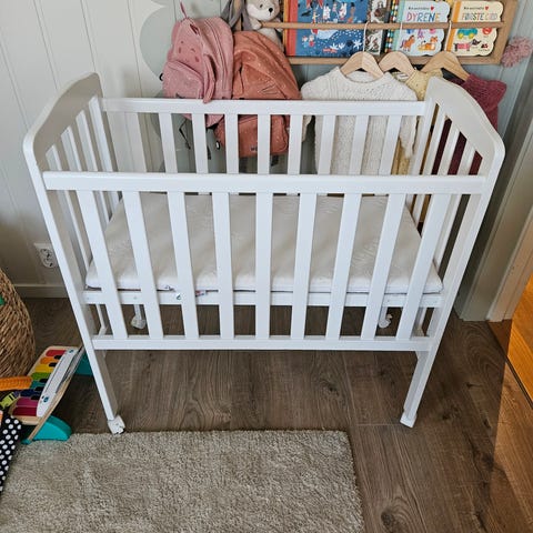 Madrass følger med, nesten ikke brukt i det hele tatt. Kjøpt ny i 2024. Kun stått til oppbevaring til nå, utenom baby som har ligget i den kanskje 2-3 ganger.
