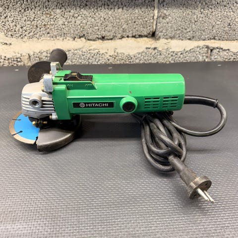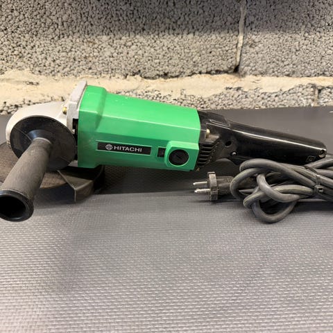 Kraftig Hitachi vinkelsliper, modell G13SD (125 mm / 5”). Leveres komplett med original koffert/eske, bruksanvisning, sidehåndtak, nøkkel og ekstra slipeskive. Normal bruksslitasje, men teknisk hel og fullt fungerende. Solid proffmaskin fra tiden da Hitachi bygde for lang levetid. Selges som avbildet.