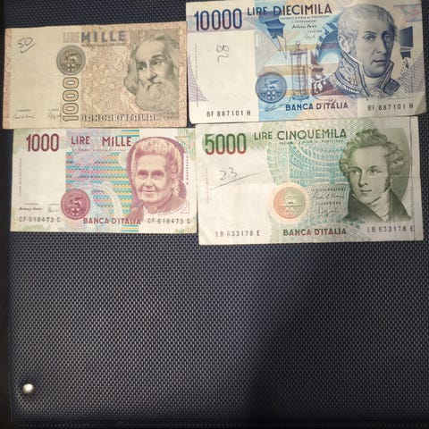 Banca d’Italia italienske lire sedler i valørene 1000, 5000 og 10000 lire. Sedlene viser ulike historiske motiver og portretter på forsiden, med bygninger og andre motiver på baksiden. Passer som samlerobjekt eller referanse for de som er interessert i eldre italiensk valuta og numismatikk.
