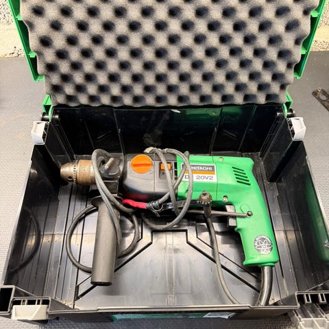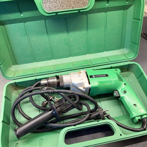 Eldre Hitachi slagboremaskin med solid metallchassis og original grønn metallkoffert. Kraftig og robust konstruksjon, laget for profesjonell bruk. Leveres med sidehåndtak og original bruksanvisning. Normal bruksslitasje etter alder, men fremstår hel og funksjonell. Dette er tung kvalitet fra tiden før plast ble standard. Selges som avbildet.