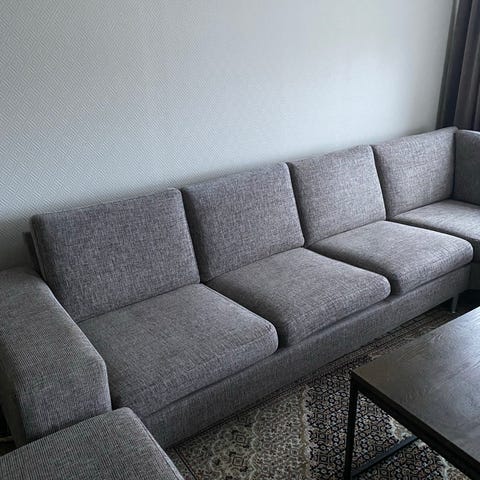 Selger en romslig og komfortabel hjørnesofa i nøytral lys beige/grå farge. Sofaen ble kjøpt ca 6 år siden og har vært godt tatt vare på. Den er i meget god stand, uten flekker eller skader og ikke minst kommer fra et røyk og dyrefritt hjem.