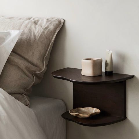 Nattbord i metall og glass. Festes på vegg. Montert. Bredde 53 cm, dybde 30 cm, høyde 51,5 cm. Høyde mellom hyllene 31,5 cm.