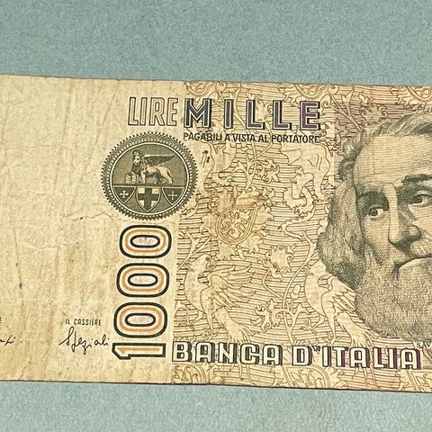 Italiensk 1000 lire seddel datert 6. januar 1982. Seddelet viser portrett på forsiden og arkitekturmotiv på baksiden. Pålydende verdi er 1000 lire, og seddelen har serienummer OB 871140 T. Objektet kan egne seg for samlere av utenlandske pengesedler eller som illustrasjons- og undervisningsmateriale om tidligere italiensk valuta.