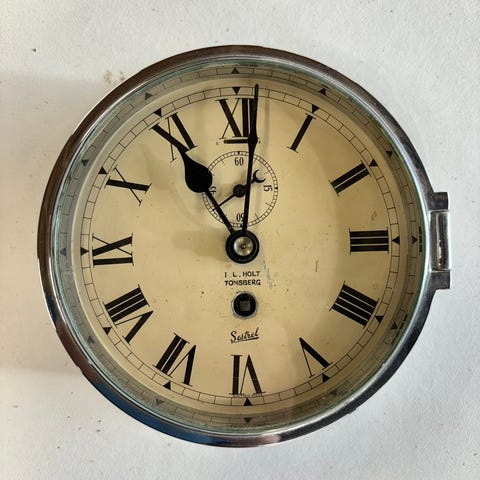 Gammelt pent mekanisk skipsur i messing fra Schatz . Opptrekket er defekt og må repareres.