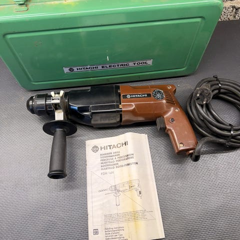 Eldre Hitachi slagboremaskin med metallgirhus og robust konstruksjon. Leveres i original grønn koffert med sidehåndtak. Normal bruksslitasje etter alder, men fremstår hel og funksjonell. Dette er en kraftig maskin bygget for lang levetid, ikke lett hobbybruk. Selges som avbildet.