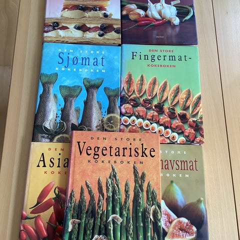 Samling med flere kokebøker om ulike typer matlaging. Bøkene dekker blant annet asiatiske retter, vegetarmat, sjømat, fingermat og norsk mat. Egnet for deg som ønsker inspirasjon og oppskrifter innen forskjellige kjøkken og matretter. Format: innbundne bøker med fargebilder og oppskrifter.