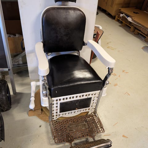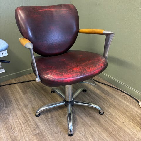 Frisørstol med hydraulisk regulering og fotpumpe. Stolen har polstret sete og rygg i svart skinn eller skinnimitasjon, med armlener i metall og svart overflate. Solid rund metallfot gir god stabilitet, og stolen har integrert fotbrett i metall.