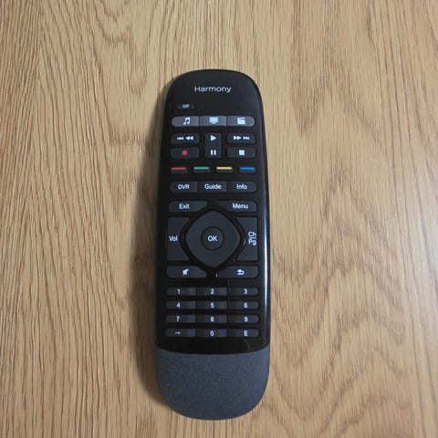 Logitech Harmony universal fjernkontroll med hub. Systemet består av en håndholdt fjernkontroll og en separat hub-enhet.