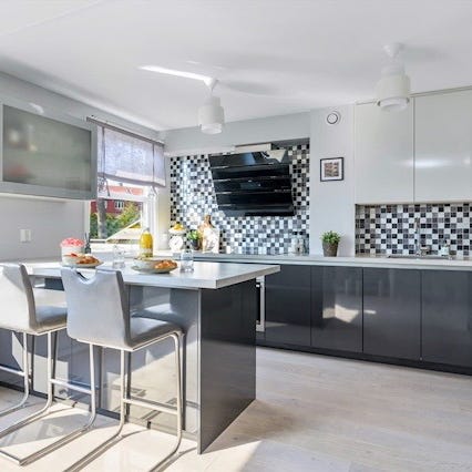 Kjøkken med fronter fra 2018, inkl. komfyr, oppvaskmaskin og vask