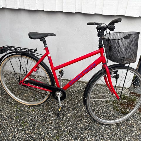 DBS hybridsykkel for dame med rammestrørrelse M og 26" hjul. Sykkelen har lav innsteg-ramme som gjør det enkelt å gå av og på. Utstyrt med kurv foran og bagasjebrett bak for transport av vesker eller mindre varer. Passer til hverdagsbruk og sykling i by og på asfalt. Farge: rød.