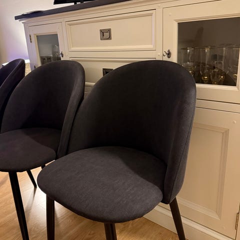 8 spisestoler heltre bjørk med koksgrå, slitesterk tekstil i setet. Høy rygg med spiler. Stolene har stått i ei spisestue som har vært brukt i selskaper, og er pent brukt og i veldig god stand.