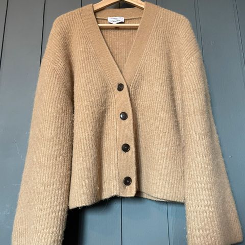 American Vintage zabidoo cardigan i størrelse XS/S. Cardiganen er laget i en mohairull-blanding, som gir et mykt og loddent uttrykk. Fargen er rosa i en lys dus tone. Modellen har rund hals og knepping med knapper foran.