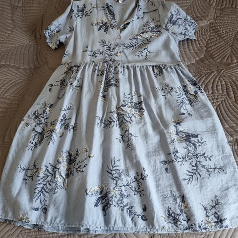 Esprit sommerkjole i bomull i størrelse 38. Kjolen har blå og hvite smale striper og er ermeløs. Den har utringning med åpne felt i ryggen og utsvingt skjørt med legg. Materialet er lett og egnet for bruk i varme perioder. Passer som hverdagskjole eller til enkle sommeranledninger.
