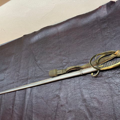 Offiserssabel i metall med tilhørende balg. Sabelen har håndbeskytter og grep i messing med profilert utforming. Bladet er rett og smalt, og balgen er tilpasset bladets lengde. Egner seg som samleobjekt, dekorasjon eller rekvisitt.
