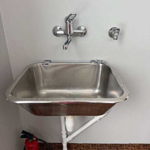 Rustfri stålvask med tilhørende veggmontert blandebatteri. Vasken har avrundede hjørner og integrert avløp i bunnen. Blandebatteriet har separate hendler for varmt og kaldt vann, markert med rød og blå farge, samt festeplater for montering på vegg. Kommer også med kobling til vaskemaskin. Egnet som arbeidsvask eller grovvask i for eksempel vaskerom, garasje eller bod, der det er behov for en robust stålvask med manuell blanding av vann.