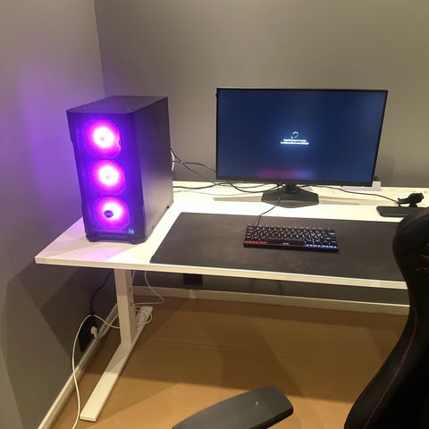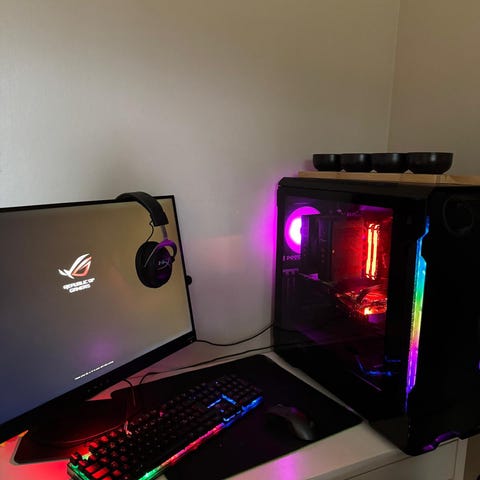 Komplett gamingoppsett med 2 skjermer, 2 tastatur, mus og trådløst gaming headset.