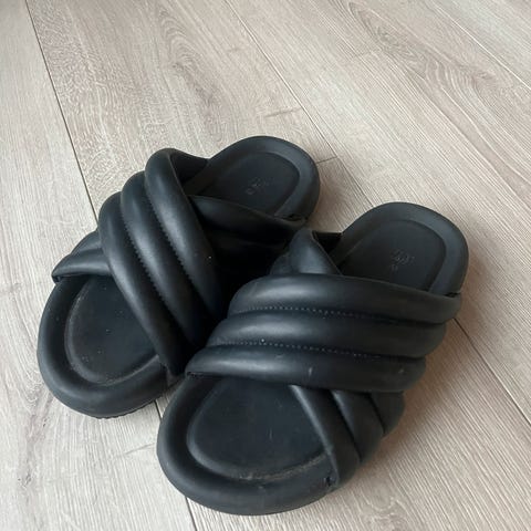 Hoka sandaler i størrelse 40. Modellen er en slip-on sandal med åpen tå og bred rem over foten. Fargen er svart. Sandalene har strukturert såle og fotseng i syntetisk materiale. Egnet til hverdagsbruk, innendørs og utendørs, for både dame og herre avhengig av passform og fotbredde.