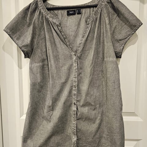 bonprix denimskjorte for dame i størrelse L. Skjorten er i blå denim med knappestolpe foran og brystlomme med klaff og brodert tekst. Ermene kan brettes opp og festes med knapp. Plagget har snøring i livet og er laget i denimstoff. Passer som hverdagsplagg eller til en uformell stil.