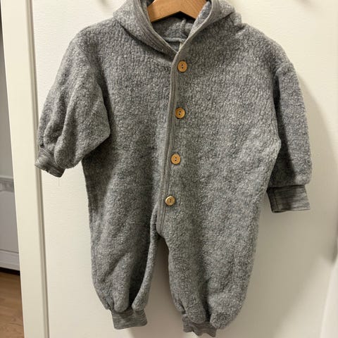Brukt Nøstebarn heldress i ull i brun farge, unisex, størrelse 62/68. Ny knapp øverst, se bilde, men original reserveknapp ligger inni dressen.