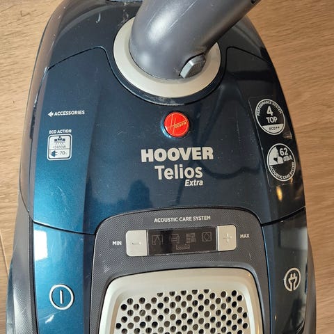 Egnet til rengjøring av gulv og tepper i hjemmemiljø. Merking på apparatet viser at det er en Telios Extra-modell med akustisk care-system for dempet lydnivå sammenlignet med enkelte eldre støvsugere.