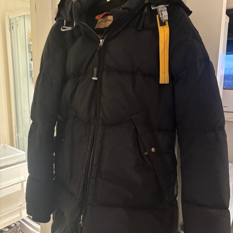 Selger min Parajumpers Long Bear i størrelse S. Lang modell i svart polyamid med vattert fyll og hette med pelskant. Jakken har glidelåslukking foran og flere praktiske lommer.