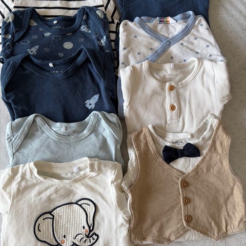 Newbie bodyer i størrelse 62 for gutt. Sett med flere plagg i ulike farger og mønstre, blant annet omslagsbodyer, body med dyremotiv og body med påsydd vest og sløyfe. Passer til hverdagsbruk og anledninger for baby i størrelse 62. Pent brukt en kort periode