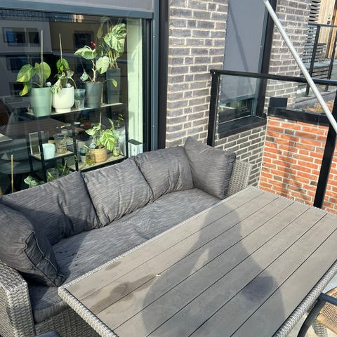 IKEA SOLLERÖN modul til balkong/ hage i plastrotting. Vedlikeholdsfritt og tåler å stå ute. Praktisk oppbevaring under setene. Kjøpt i 2020, pent brukt.