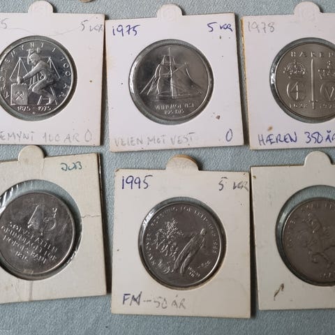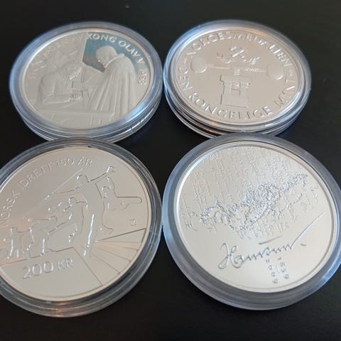 Stor lott med sølv mynter oversiktsbilde 1 og 2, deretter nærbilder av det som er i Lotten. Siste bilde fullstendig oversikt over antall mynter og sølv innhold i gram. Da sølv verdien svinger litt opp og ned vil jeg selge til denne prisen nå, som er nær spot. Ingen pruting. Norgespakke på 160kr, kommer i tillegg, ellers hentes på adressen.