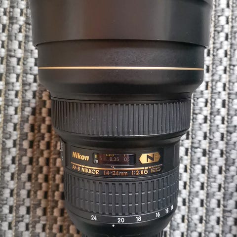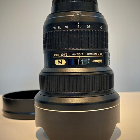Nikon AF-S Nikkor 14-24mm f/2.8G ED er et vidvinkelzoom-objektiv med brennviddeområde 14–24 mm og konstant lysstyrke f/2.8. Objektivet har innebygd Silent Wave Motor (SWM) for stille autofokus, ED-glass og nanokrystallbelegg (N) for å redusere refleksjoner og gi bedre kontrast. Konstruksjonen er robust med internfokusering (IF). Passer Nikon-kameraer med F-fatning som støtter AF-S-objektiver. Objektivet på bildene leveres med frontdeksel og oppbevaringsveske slik det fremkommer på bildene, dersom ikke annet er oppgitt i annonsen.